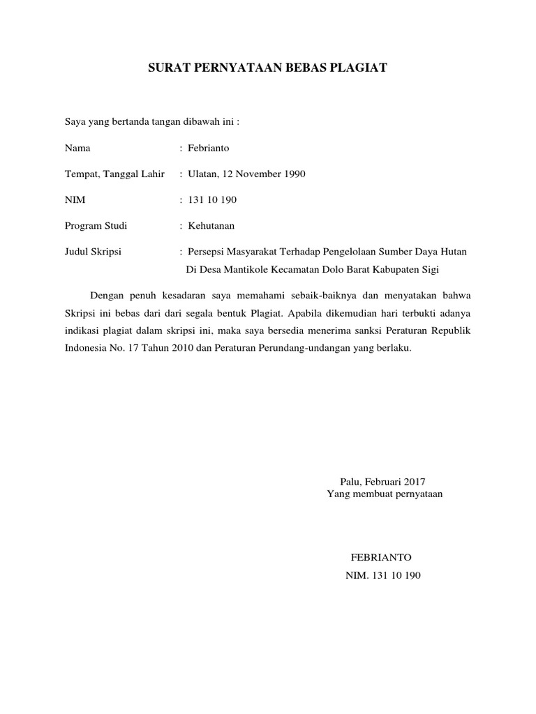 Surat Pernyataan Bebas Plagiat Sinta Unud Ac Id Awal Pdfsurat Pernyataan Bebas Plagiat Nama Dr Pdf Document from demo.fdokumen.com Surat pernyataan bebas plagiat saya yang bertandatangan di bawah ini : Tugas akhir / skripsi*) ini adalah murni merupakan gagasan, rumusan dan penelitian saya sendiri, tanpa bantuan pihak lain kecuali arahan dari tim dosen pembimbing. Gilang ramadhan tempat/tanggal lahir : Halaman pernyataan tidak melakukan plagiat bagian atau keseluruhan isi skripsi ini tidak pernah diajukan untuk mendapatkan gelar akademis pada bidang studi dan/atau universitas lain dan tidak pernah dipublikasikan/ditulis oleh individu selain pennyusun kecuali bila dituliskan dengan format kutipan dalam isi skripsi. Iii surat pernyataan persetujuan akses. Contoh surat pernyataan bebas plagiat saya yang bertanda tangan di bawah ini : Dalam pembuatan sebuah tugas akhir atau skripsi dibutuhkan sebuah pernyataan yang menyatakan bahwa penelitian skripsi tersebut merupakan asli buah karya dari penulis. Motivasi, doa dan kasih sayang sehingga terselesaikan skripsi ini.